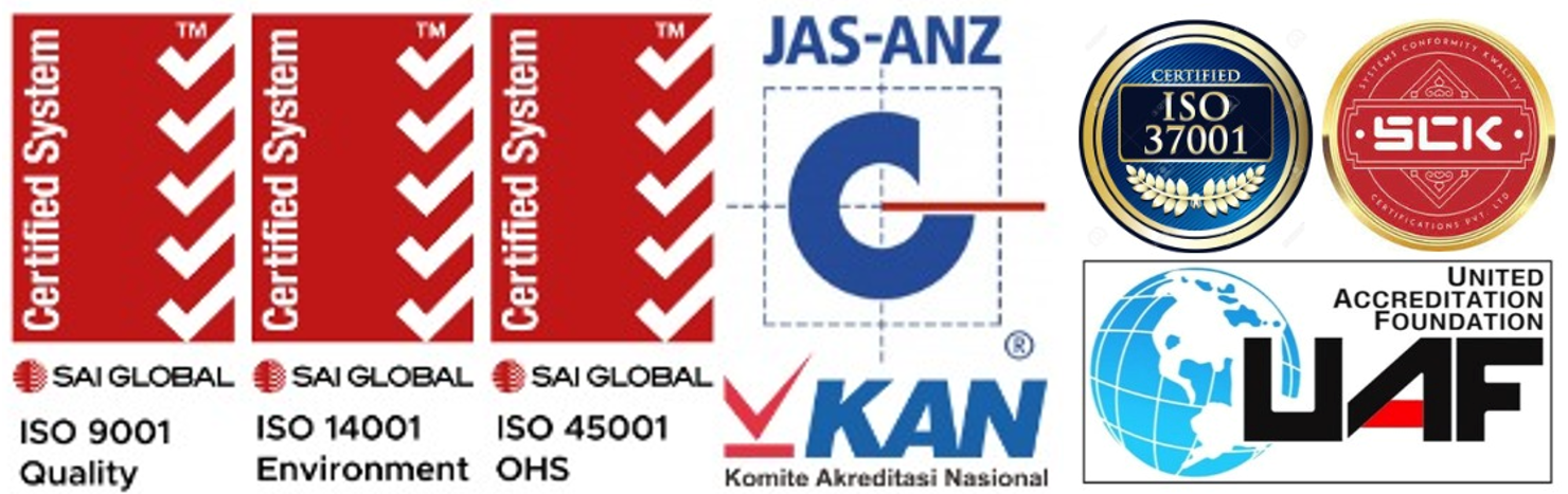 SERTIFIKAT PERUSAHAANSertifikat Manajemen Mutu : ISO 9001;2015-QMS40756 Sertifikat Manajemen Lingkungan : ISO 14001;2015-EMS41748 Sertifikat Manajemen Anti Penyuapan : ISO 37001;2016-SCK/19/GCW/25/62/5104 Sertifikat Manajemen K3: ISO 45001:2015-0219190 |